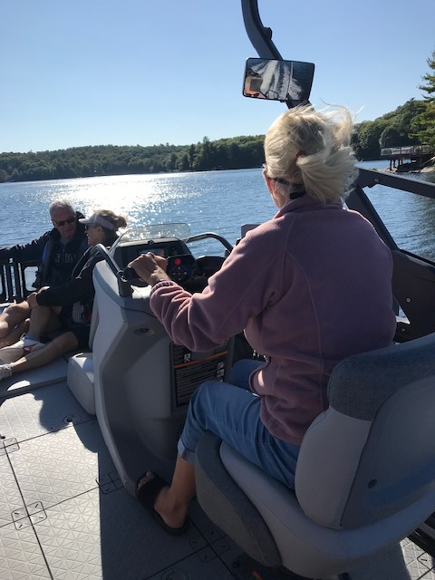 Thrills, but no spills, were had one fine afternoon on the neighbouring lake where our host’s sister had her own lovely property, south facing on a shallow inlet. We took our seats aboard her new speedboat. First time out was a fast and thrilling ride for me on the dickie seat up front towards the prow, pulling her brother on his water skis on a bracing circuit of the placid dark waters. The second trip had us all aboard at the back, at a more leisurely pace, for a fascinating sightseeing tour around the shoreline.